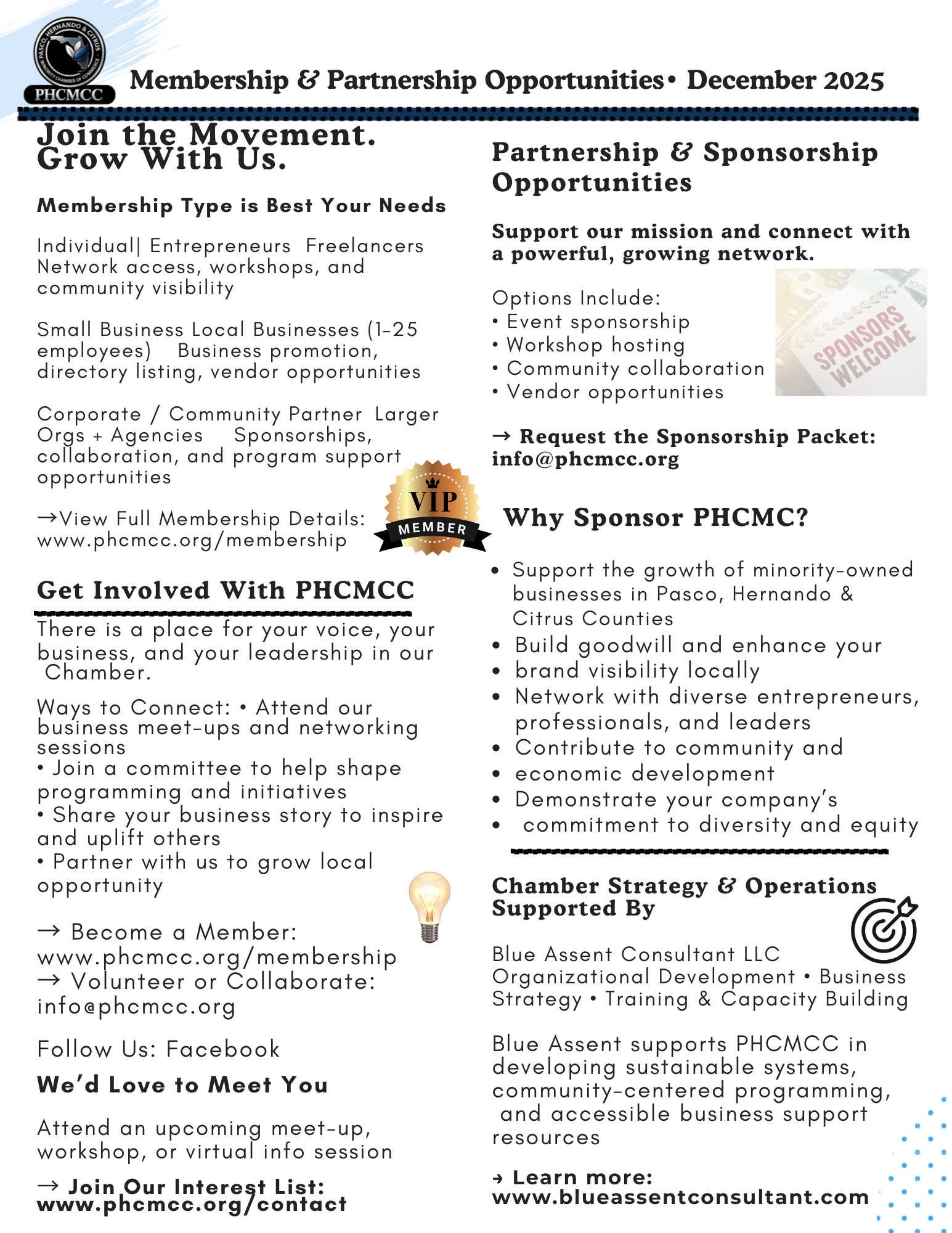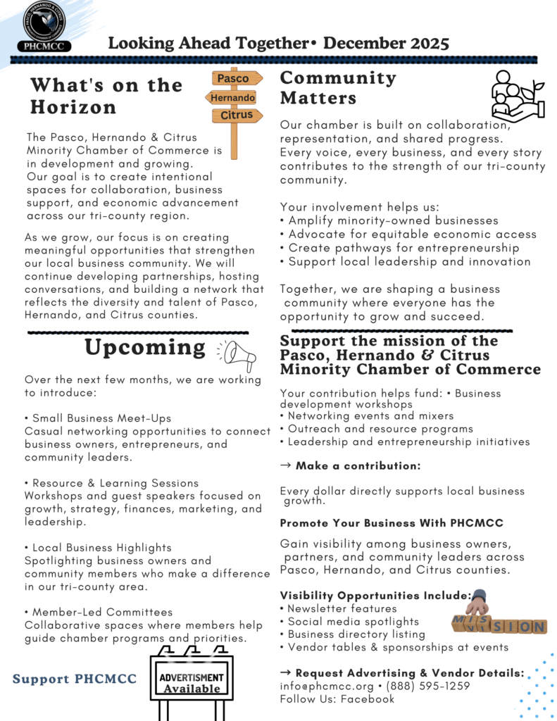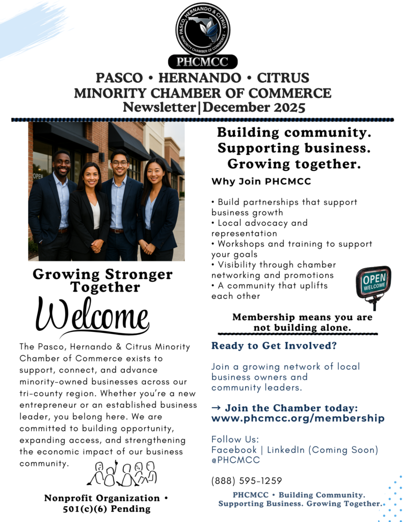 The Pasco, Hernando & Citrus Minority Chamber of Commerce is dedicated to advancing economic opportunity for minority-owned and underserved businesses throughout our region. We connect entrepreneurs, professionals, and community leaders with the resources, partnerships, and advocacy needed to grow strong, sustainable businesses.