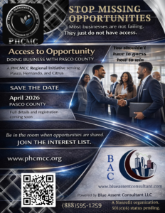 « All Events Save the Date: Access to Opportunity April 30 @ 8:00 am - 5:00 pm « PHCMCC Grand Opening Announcement https://forms.gle/zFFQLhVi6r4QBawa6 Add to calendar Google Calendar iCalendar Outlook 365 Outlook Live Details Date: April 30 Time: 8:00 am - 5:00 pm Venue TBD P.O. Box 5125 Spring Hill, FL 34611 United States Phone 8885951259 Organizer Pasco, Hernando & Citrus Minority Chamber of Commerce Phone 8885951259 Email info@phcmcc.org